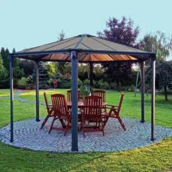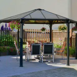 The Monaco Garden Gazebo allows you to turn your outdoor area into a roomy gathering space, an addition to your home and lifestyle, a smoking shelter or a private getaway. It is well-designed for entertaining and celebrating special family events, dining or just as a relaxation area. You will enjoy this luxurious all weather gazebo, on rainy as well as on fantastic sunny days. The Monaco gazebo is a hexagon shaped centrepiece; it provides an attractive focal point to please the eye, and allows you to increase the pleasure you derive from your outdoor space in numerous ways. It is the ideal setting to unwind at the end of the day in your outdoor leisure spa or lounging area, and perfect for hosting a BBQ grill bash or a romantic dinner for two.