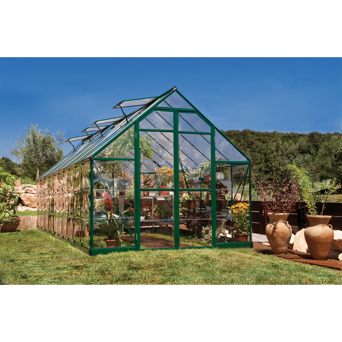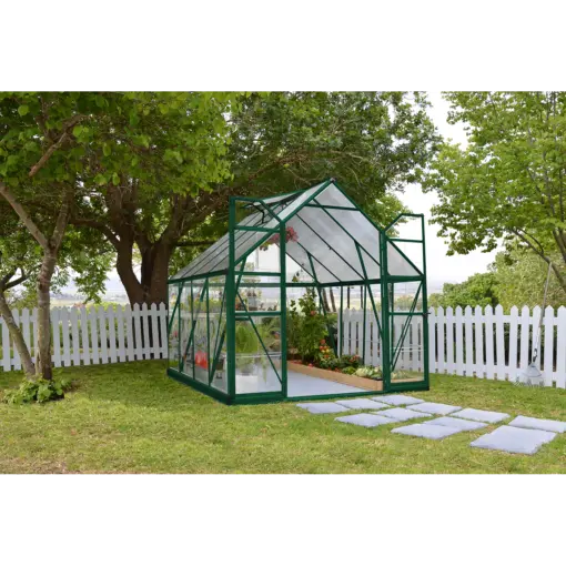 Balance series provide you with a spacious, aesthetic and durable greenhouse, and your plants with optimal nurturing conditions. It features two types of virtually unbreakable Polycarbonate panels, creating an ideal combination of sunlight transition, heat insulation and safety for all your gardening needs. The large work-space and wide double door provide the most enthusiastic gardener plenty of growing room with enough to spare for seeding and storing tools and supplies. Powder coated aluminium frame with internal, strong support beams and rust-resistant perimeter steel base in a forest green finish, provide protection against strong winds and heavy snow load as well as for adding structural support, stability and alignment.