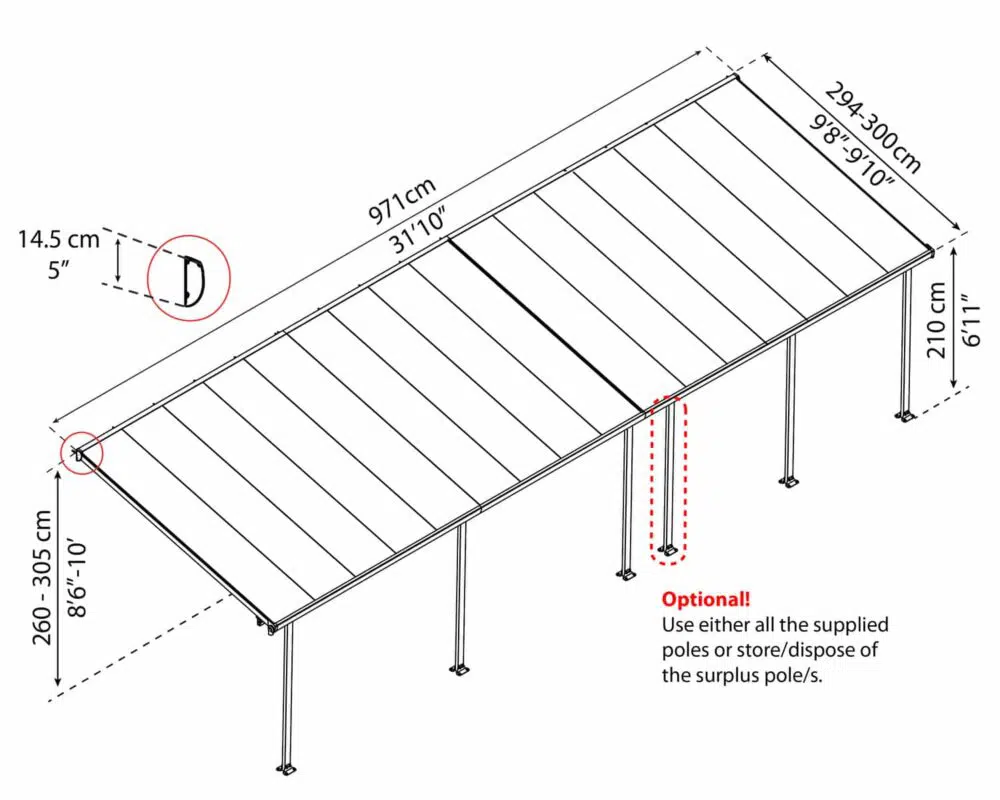 • The Feria is a high performance structure, with flexible positioning poles enabling you to set your required height at the wall connection, the distance from the house and between the poles at the front.